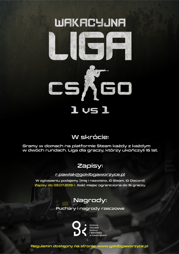 Zgłoszenia do ligi (imię i nazwisko, ID Steam, ID Discord) należy przesyłać na adres e-mail: r.pawlak@gokibgaworzyce.pl do dnia 09.07.2021 r.